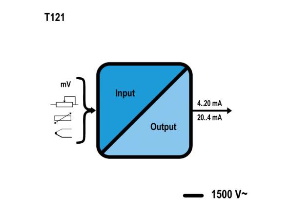 T121 – преобразователь сигналов термосопротивлений в унифицированный выходной сигнал 4...20 мА.