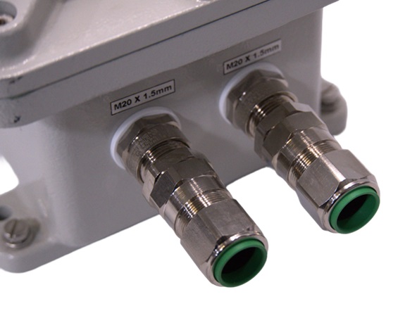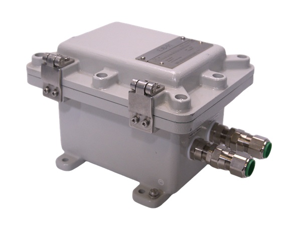 Взрывонепроницаемая оболочка из алюминия Exd ЕJB01 размером 220х170х152 мм. Выполнена с двумя кабельными, для бронированного кабеля, вводами на стороне В - 20SE1FU1RA5, клеммами UT-2,5.