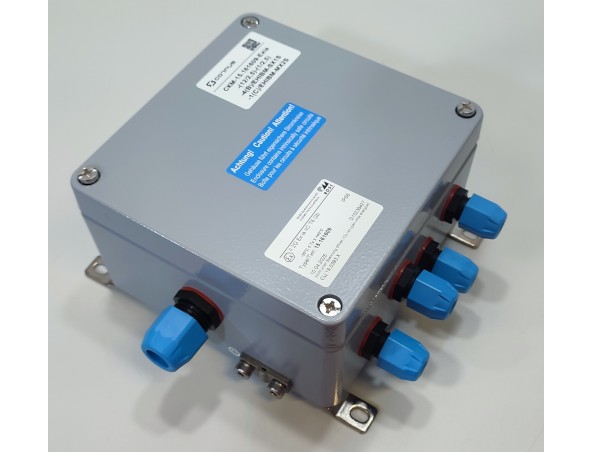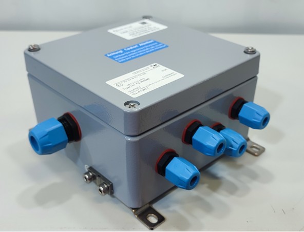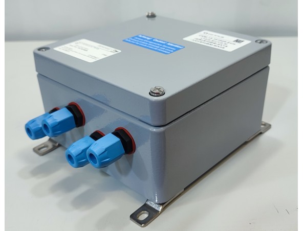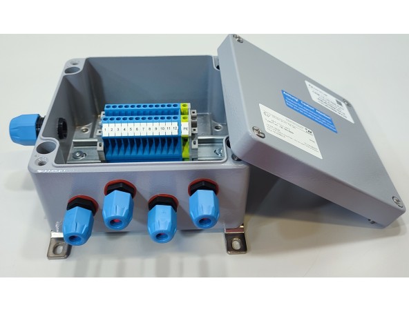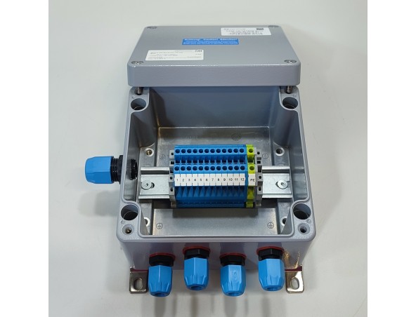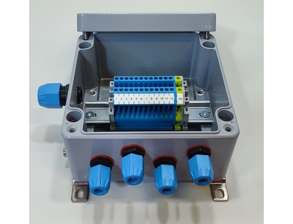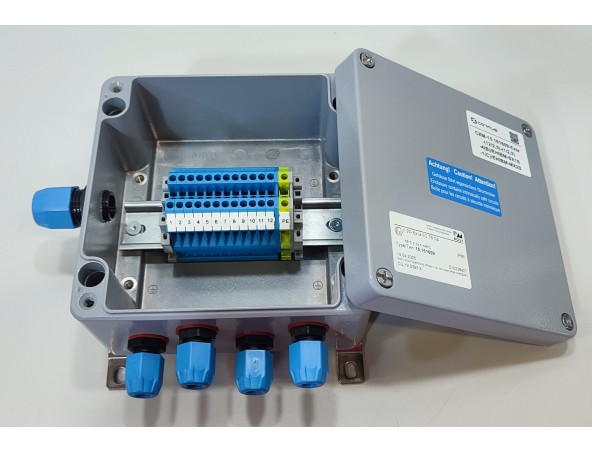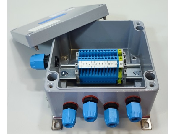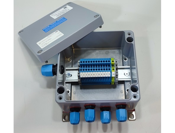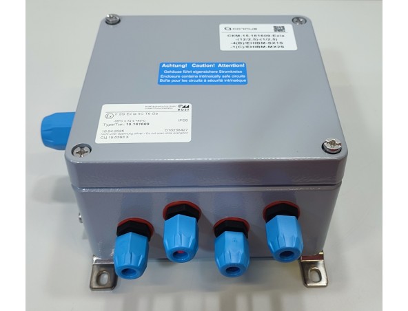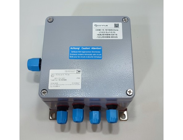 Коробка розподільча іскробезпечна II 2G Ex іа IIC T6 Gb з алюмінію, з 12-ма гвинтовими клемами (блакитні), перетином 2,5 мм, однією клемою заземлення, перетином 2.5 мм, чотирма поліамідними Ехе введеннями (blue) типу EHIBM-SX1S, М16х1.5, для гнучкого кабелю на стороні В та одним поліамідним введенням (blue) типу EHIBM-МХ2S , М20х1.5, для гнучкого кабелю на стороні С.