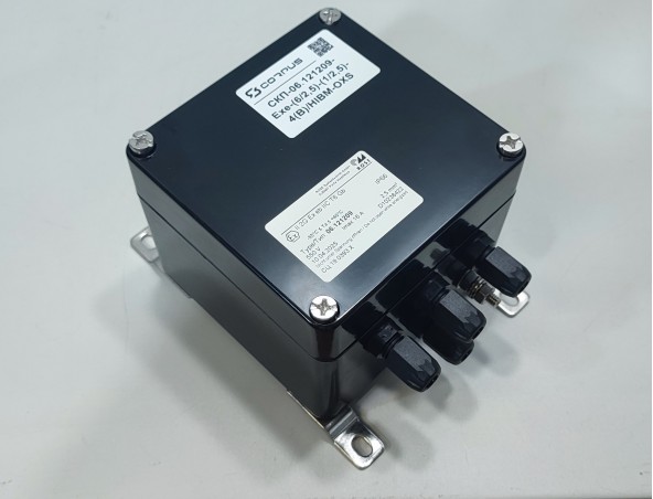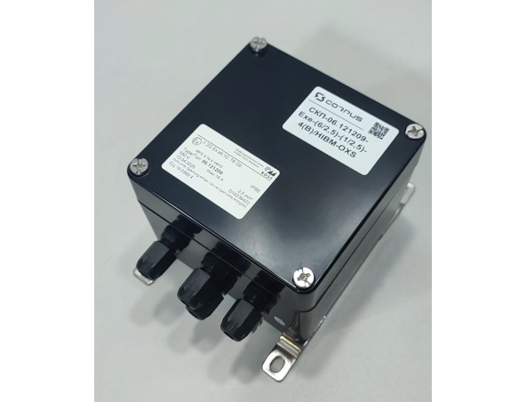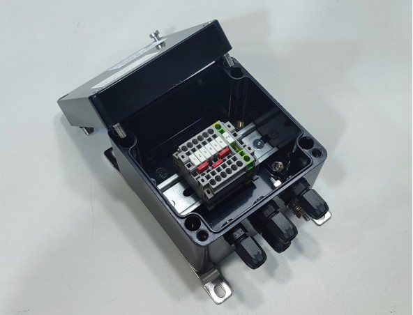 Коробка розподільча підвищеної безпеки II 2G Ex eb IIC T6 Gb з полiестеру, з 6-ма клемами перетином 2,5 мм, однiєю клемою заземлення, перетином 2,5 мм, з чотирма полiамiдними введеннями HIBM-0XS, М12х1,5 на сторонi В, з кріпленням на стіну та шпилькою заземлення.